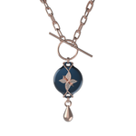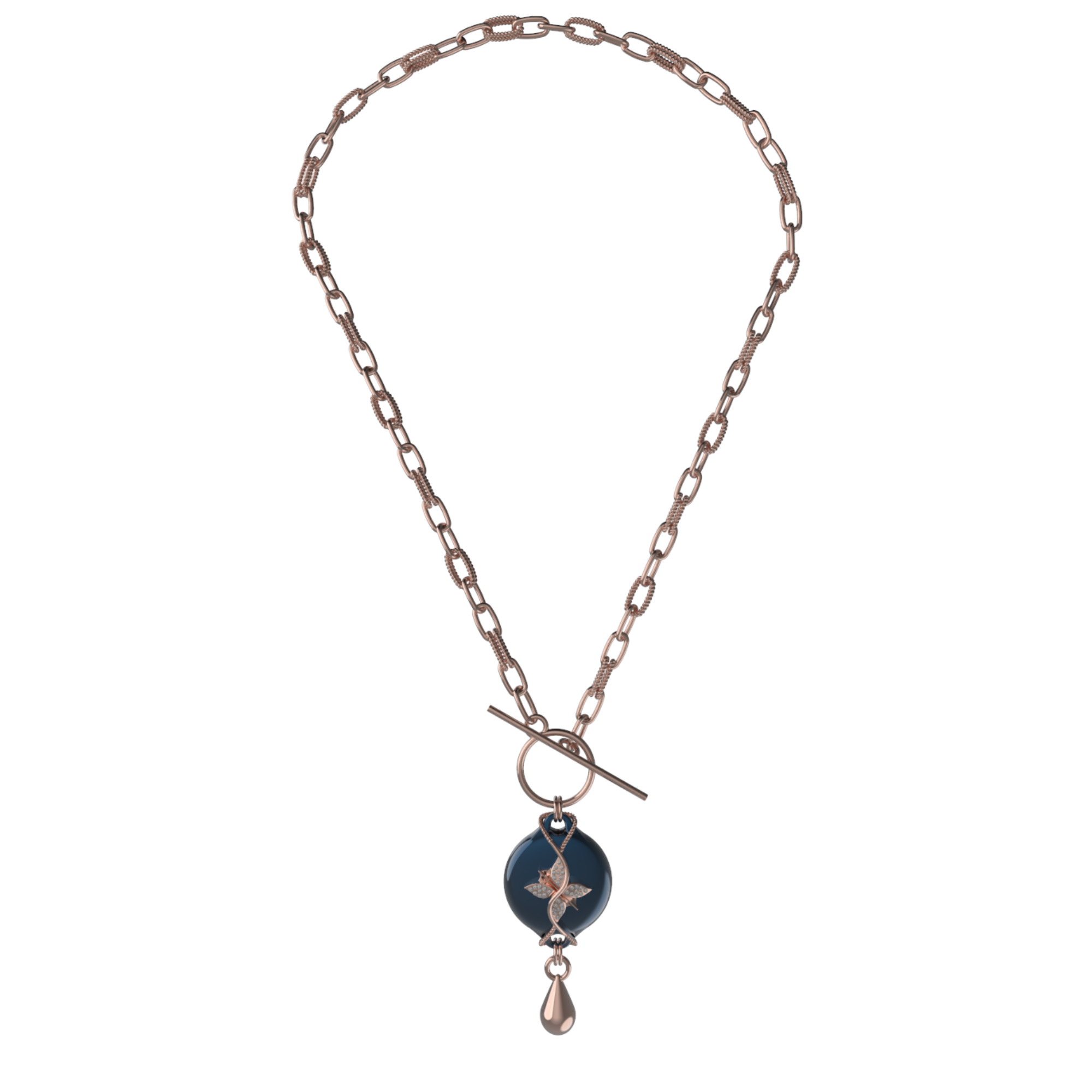 This design features the Paperclip Chain in a rose finish, offering a structured, modern look with a bold yet balanced presence. Its defined links add clarity and shape, making it a strong choice for tailored outfits, elevated evening looks, and clean silhouettes. The rose tone adds softness and warmth, while the dark blue centerpiece brings depth and visual interest to the overall design.