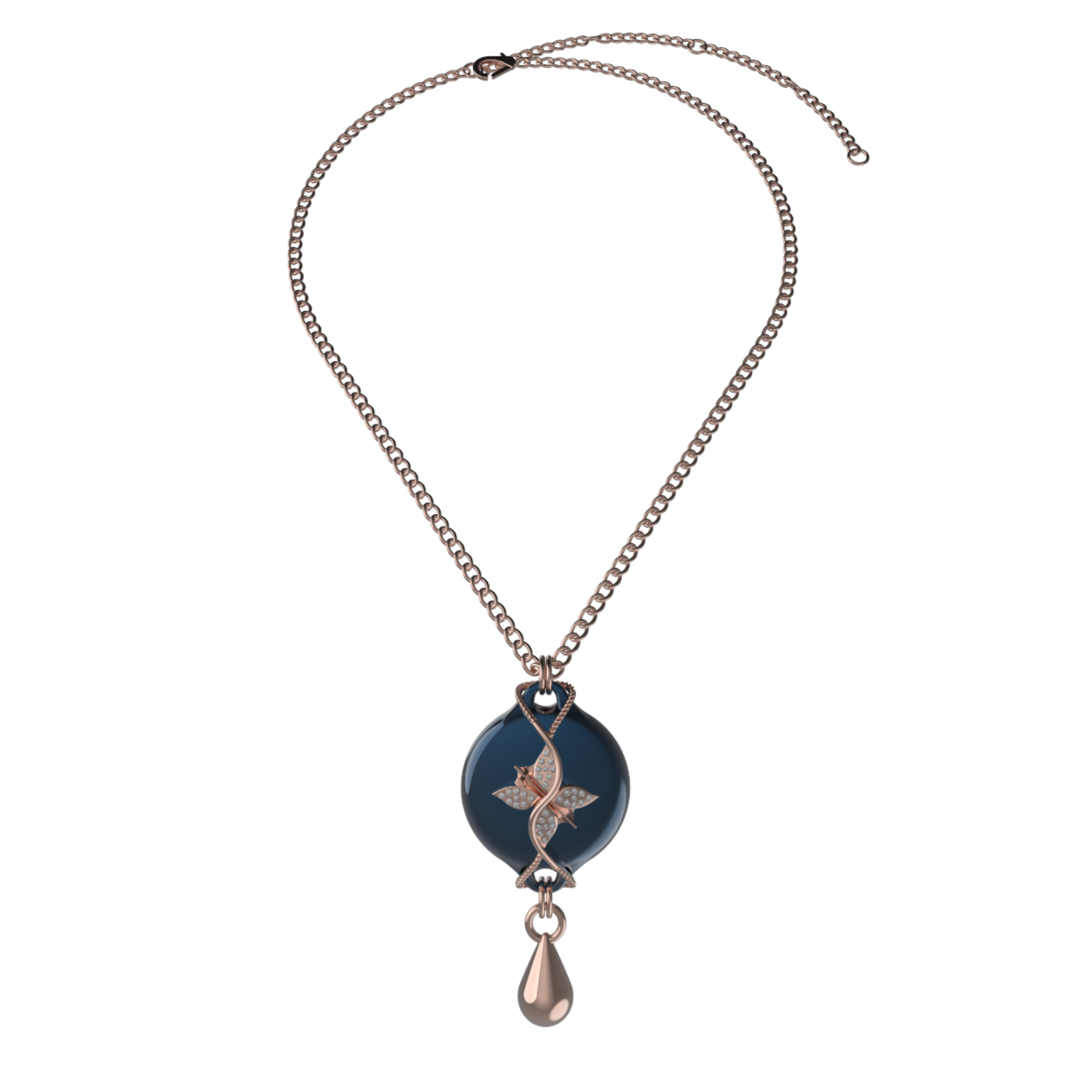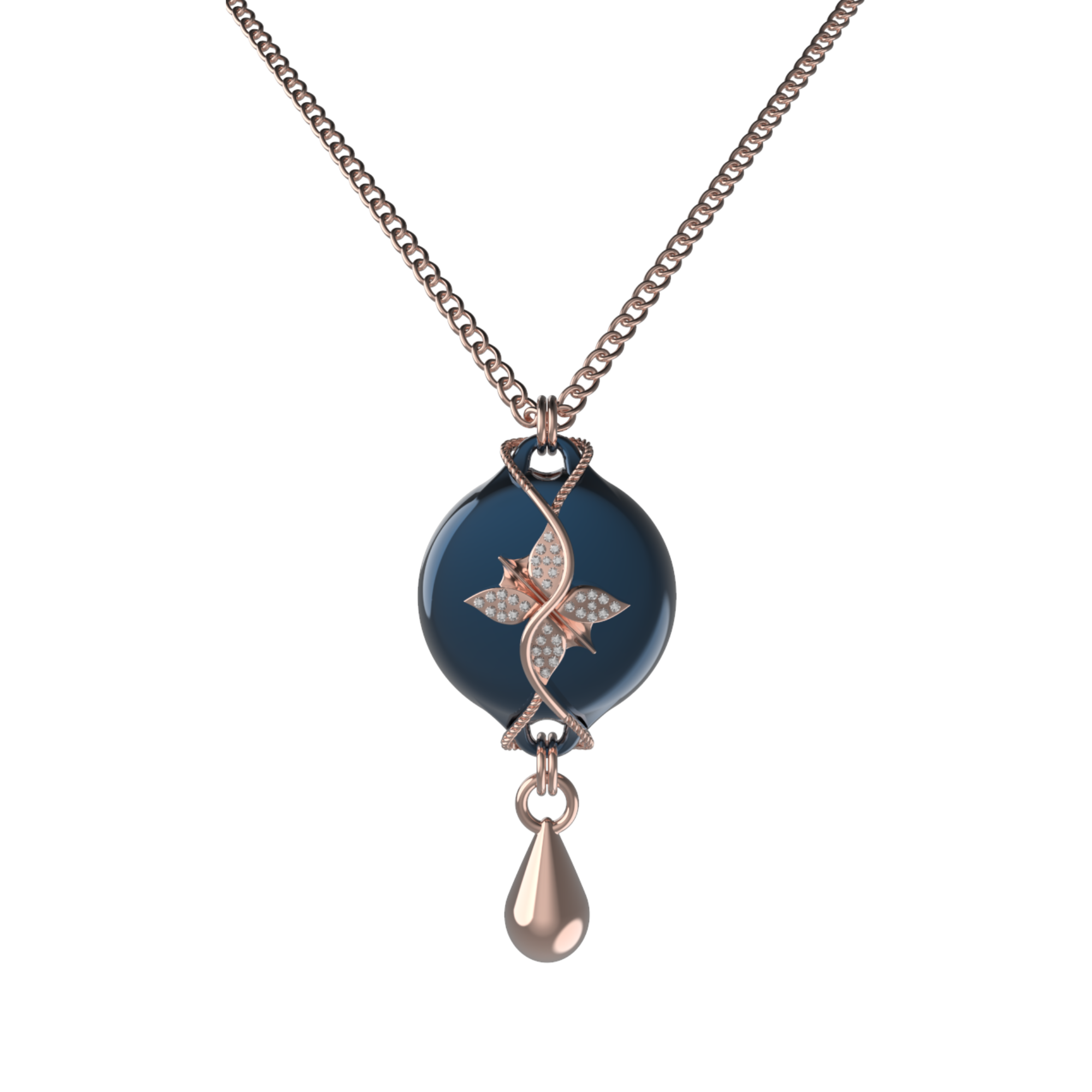 This design features the Wheat Chain in a rose finish, offering a softer, more fluid look. Adjustable for length, the chain allows the necklace to sit comfortably across different necklines, making it easy to style with both structured and flowing outfits. The rich dark blue tone adds depth and focus, while the rose finish brings warmth and elegance to the overall design.