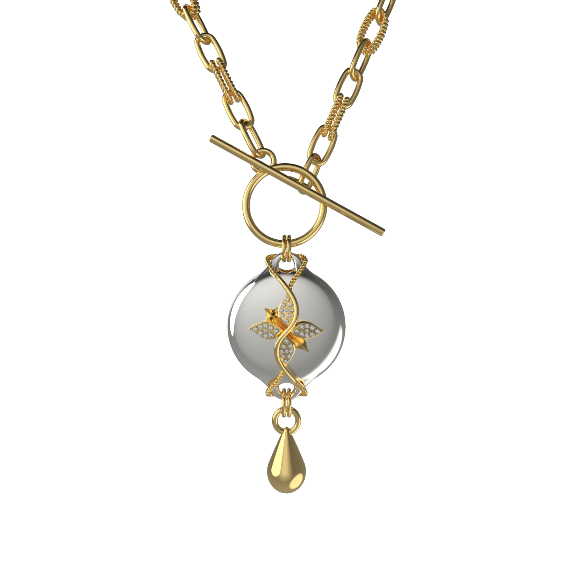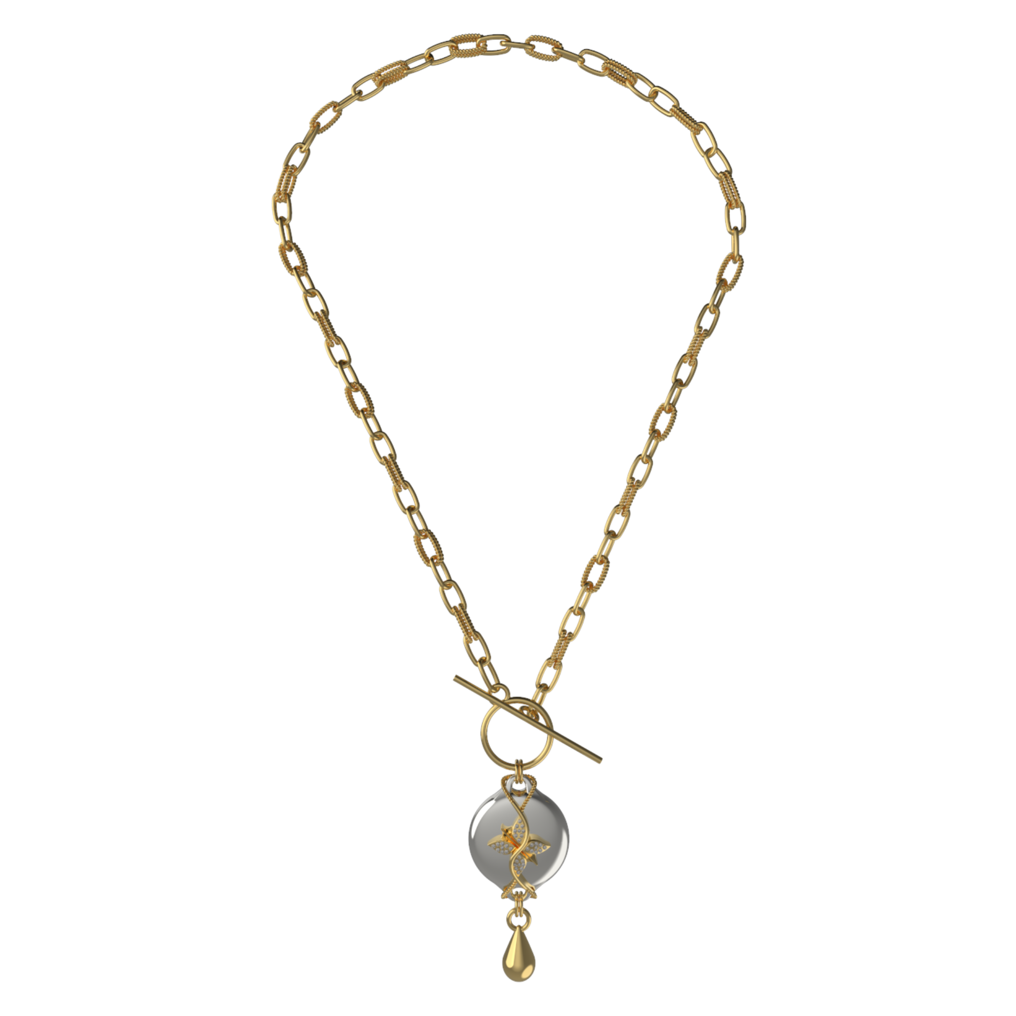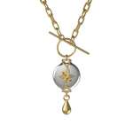 The Mahi Safety Necklace is designed for formal moments, without letting go of reassurance. This version pairs a luminous silver centerpiece with a warm gold-tone finish, creating a refined contrast that feels polished and intentional. With a high-shine finish, sculptural form, and subtle rhinestone detailing, Mahi presents as fine jewelry suited for evening wear and dress-up occasions.