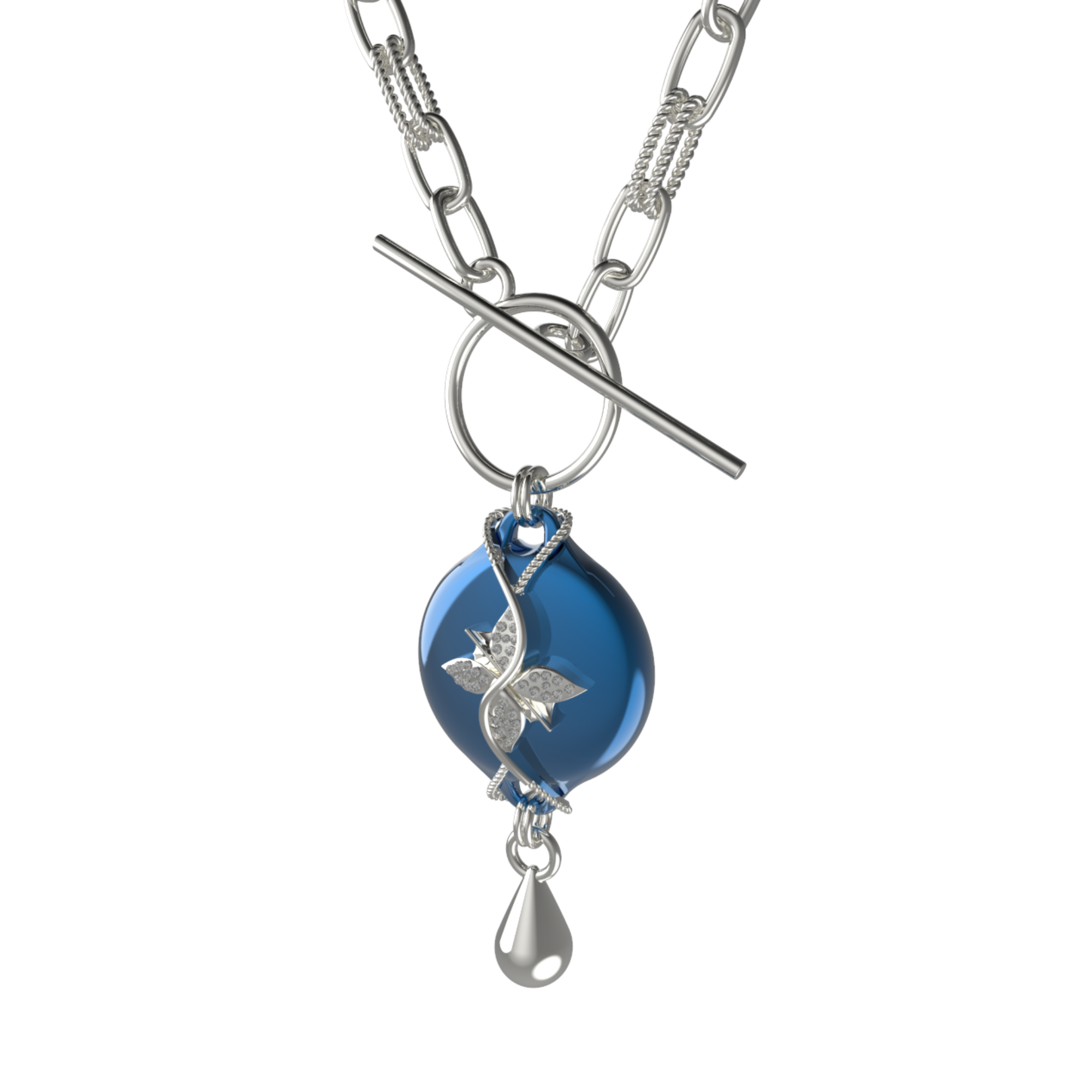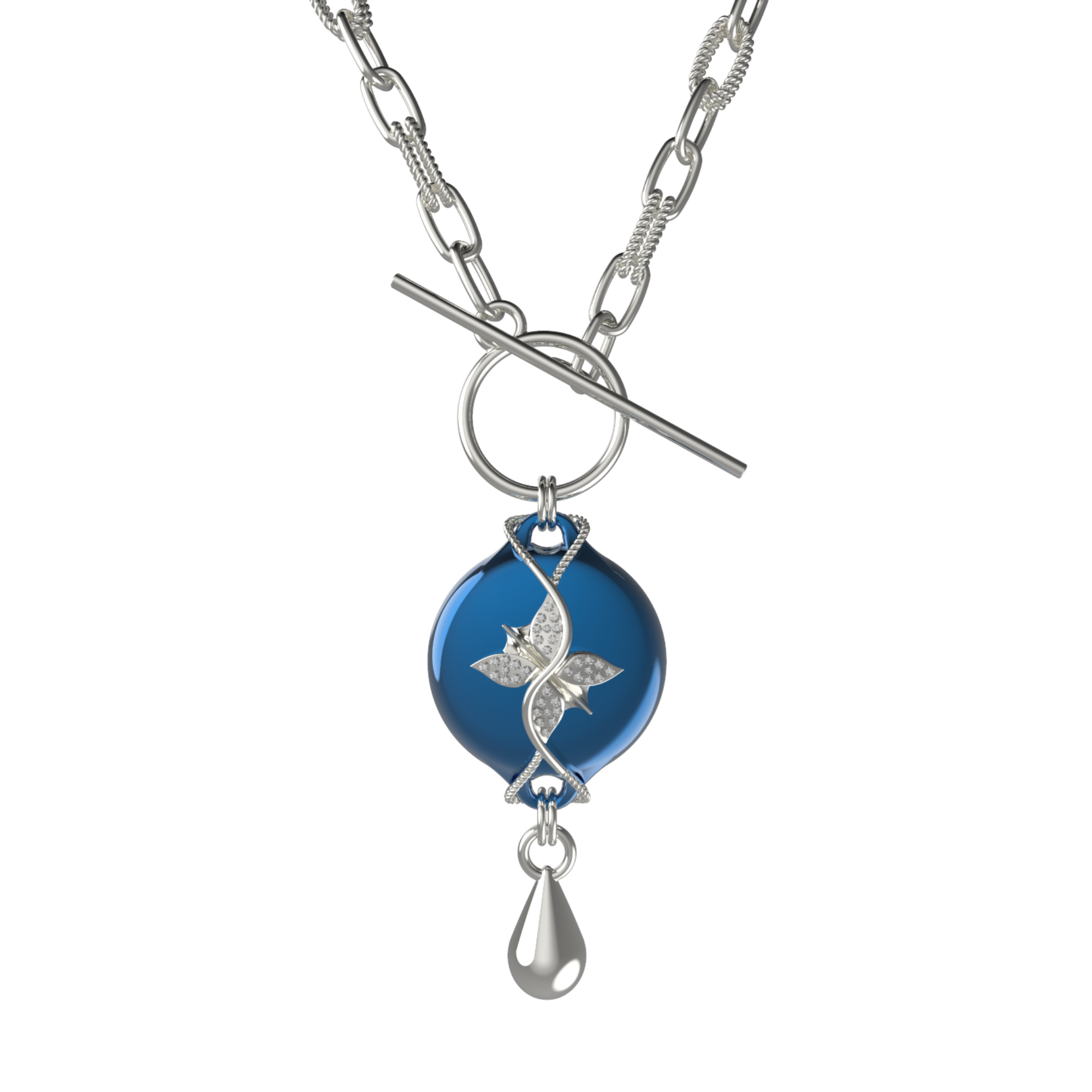 The Mahi Safety Necklace is designed for formal moments, without letting go of reassurance. This version pairs a deep blue centerpiece with a cool silver-tone finish, creating a clean, refined contrast that feels polished and intentional. With a high-shine finish, sculptural form, and subtle rhinestone detailing, Mahi presents as fine jewelry suited for evening wear and dress-up occasions.
