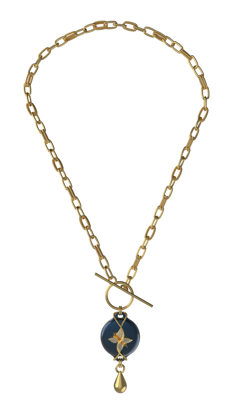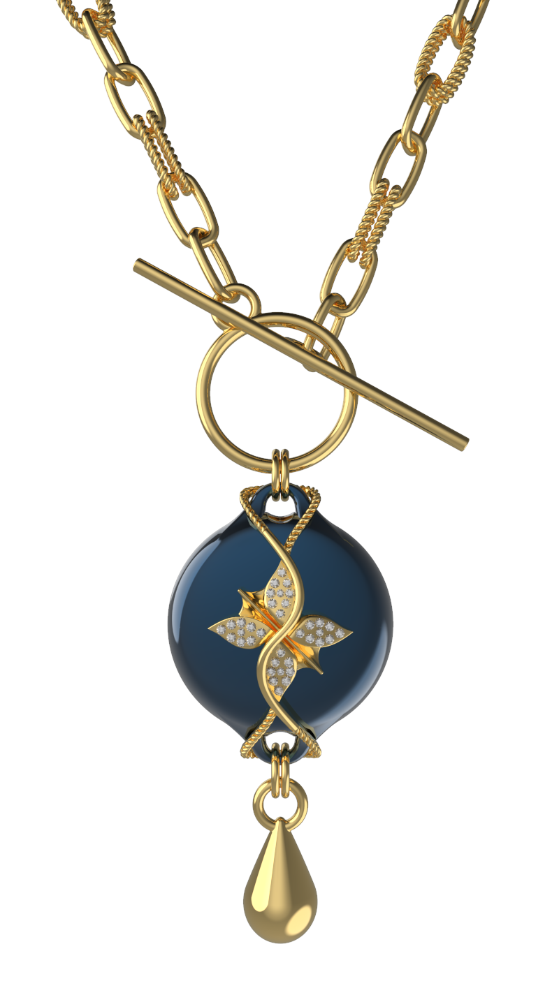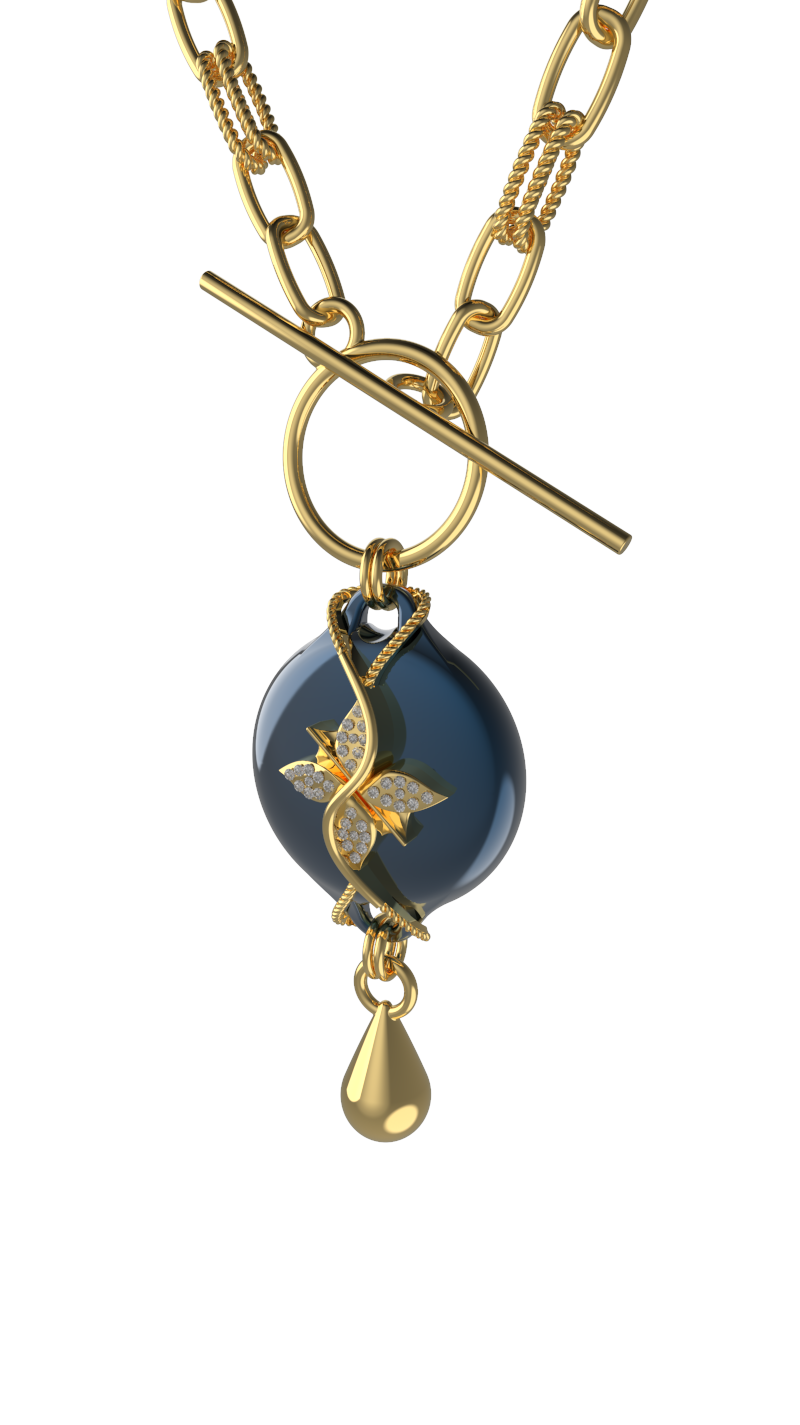 The Mahi Safety Necklace is designed for formal moments, without letting go of reassurance. This version pairs a luminous dark blue centerpiece with a warm gold-tone finish, creating a refined contrast that feels polished and intentional. With a high-shine finish, sculptural form, and subtle rhinestone detailing, Mahi presents as fine jewelry suited for evening wear and dress-up occasions.