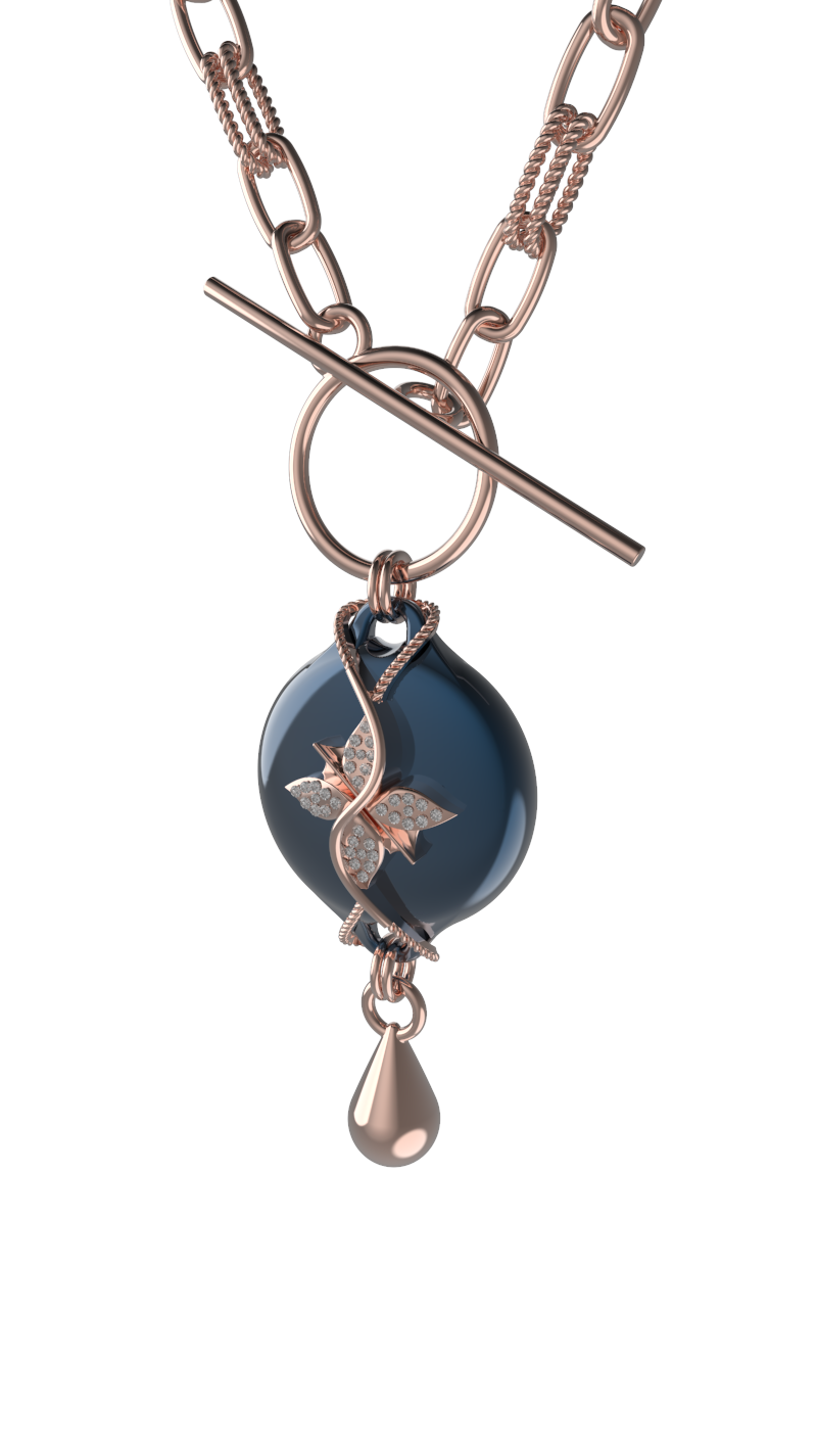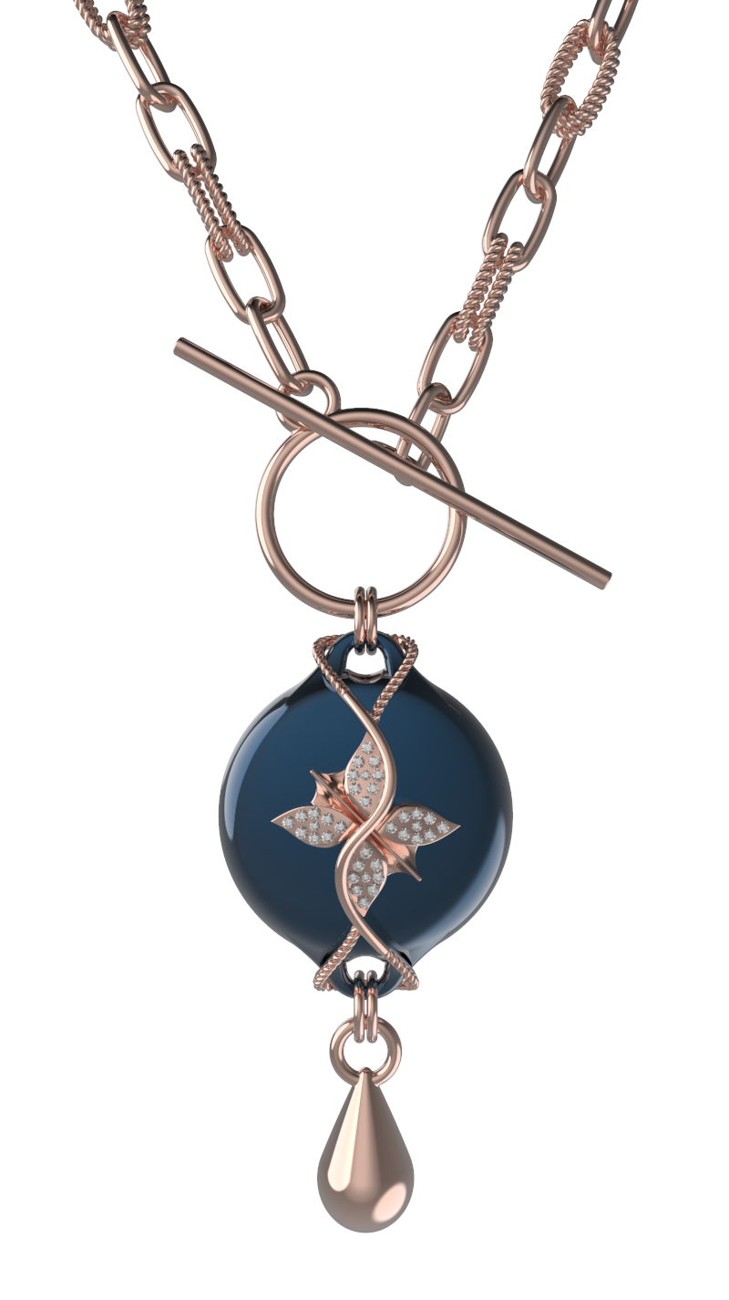 The Mahi Safety Necklace is designed for formal moments, without letting go of reassurance. This version pairs a luminous dark blue centerpiece with a warm rose-tone finish, creating a refined contrast that feels polished and intentional. With a high-shine finish, sculptural form, and subtle rhinestone detailing, Mahi presents as fine jewelry suited for evening wear and dress-up occasions.