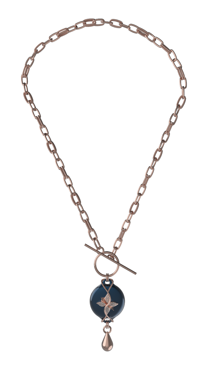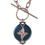 This design features the Paperclip Chain in a rose finish, offering a structured, modern look with a bold yet balanced presence. Its defined links add clarity and shape, making it a strong choice for tailored outfits, elevated evening looks, and clean silhouettes. The rose tone adds softness and warmth, while the dark blue centerpiece brings depth and visual interest to the overall design.